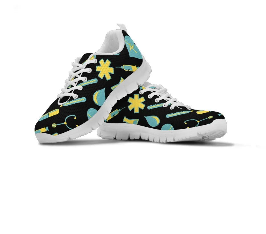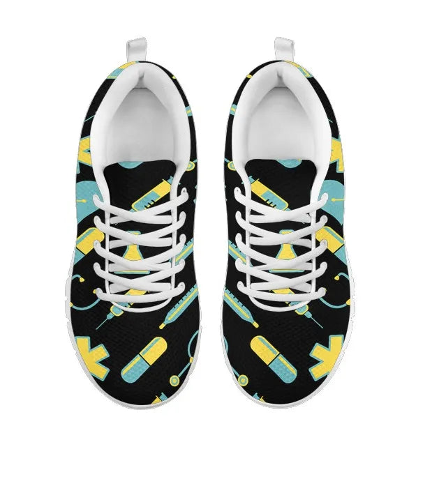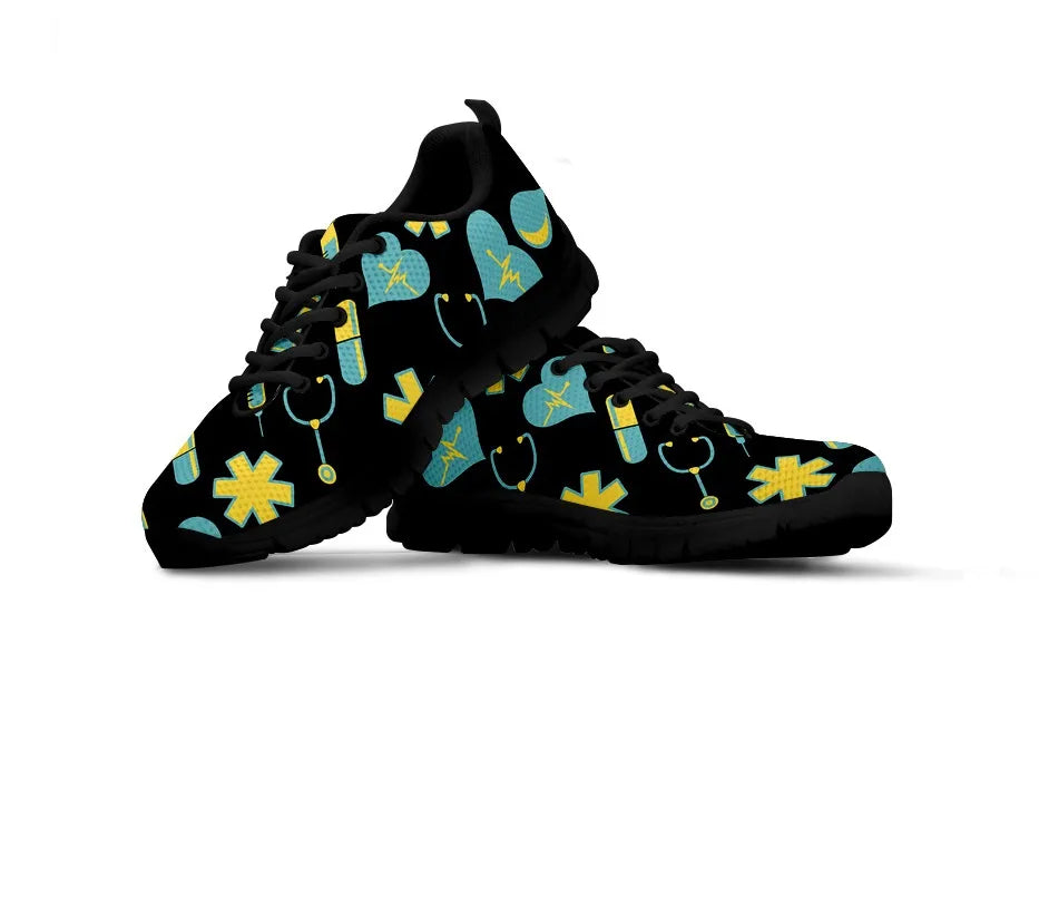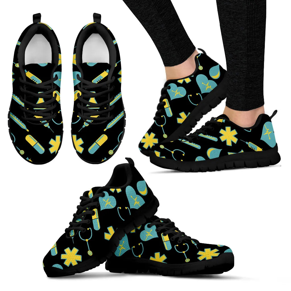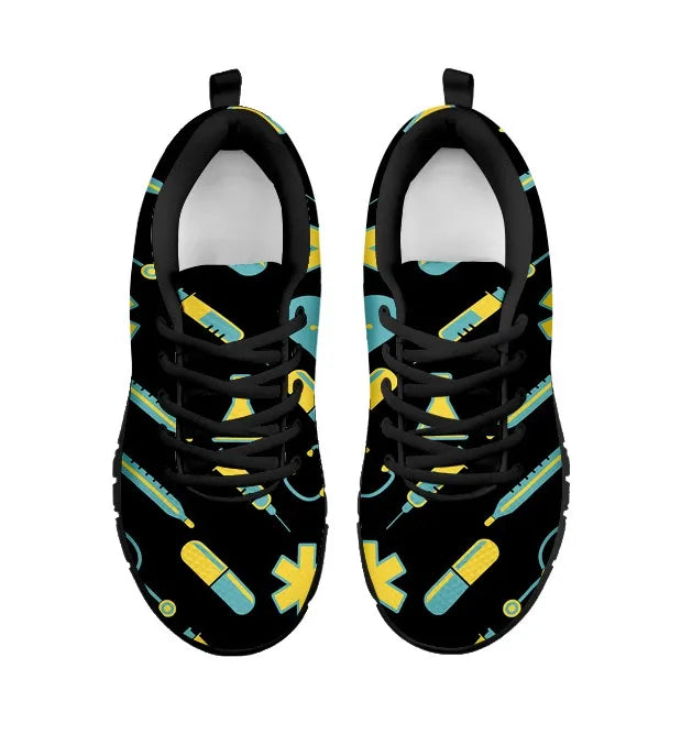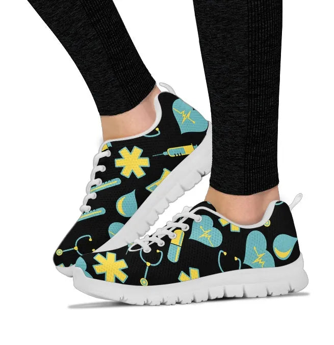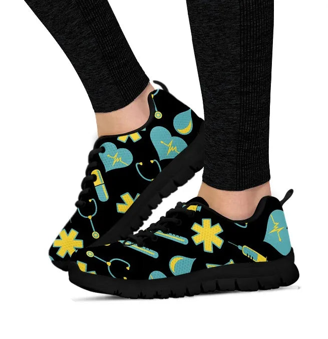 Women's Black Mesh Nurse Sneakers 2 With Yellow-Teal Medical Motif