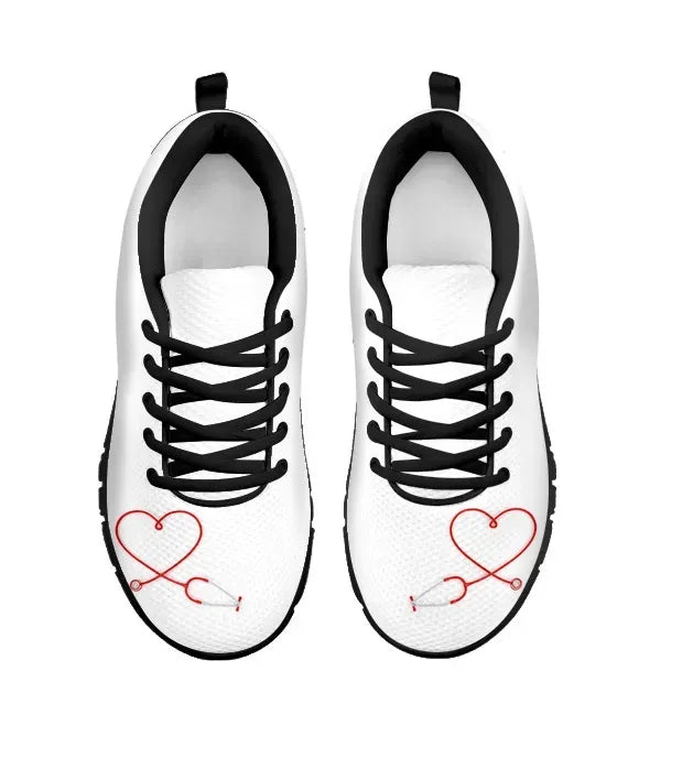 These white mesh nurse sneakers have a big red heart on the front of the sneakers. They are comfortable and trendy, and a great way of striking up conversations with strangers.