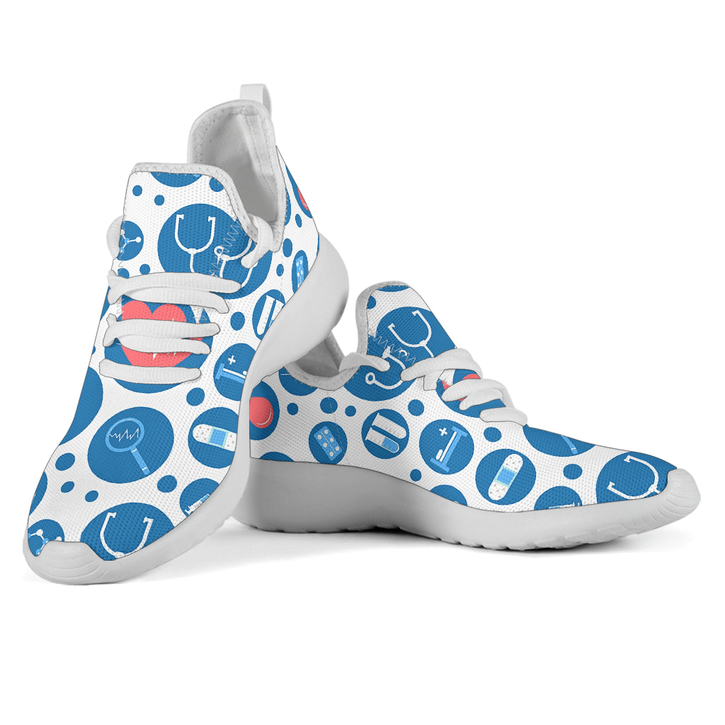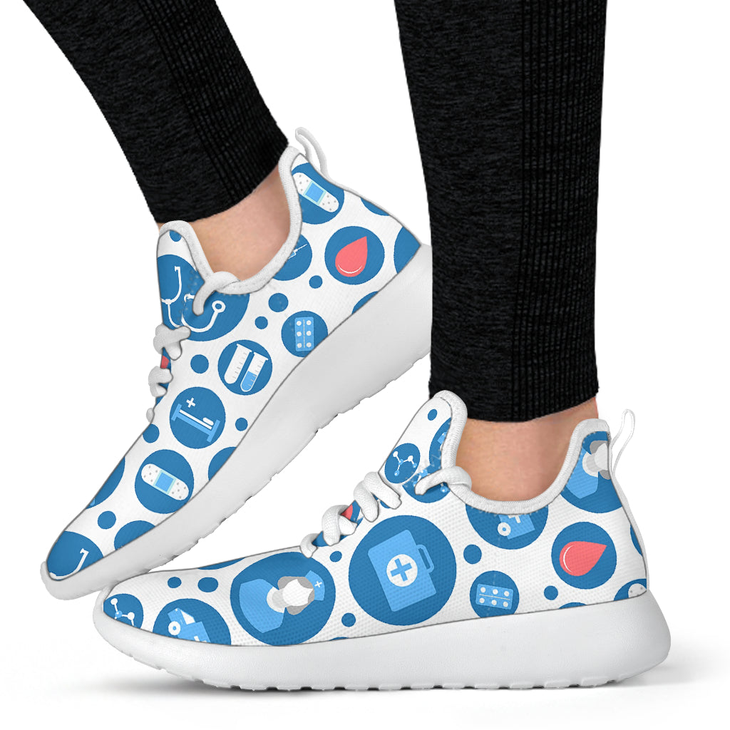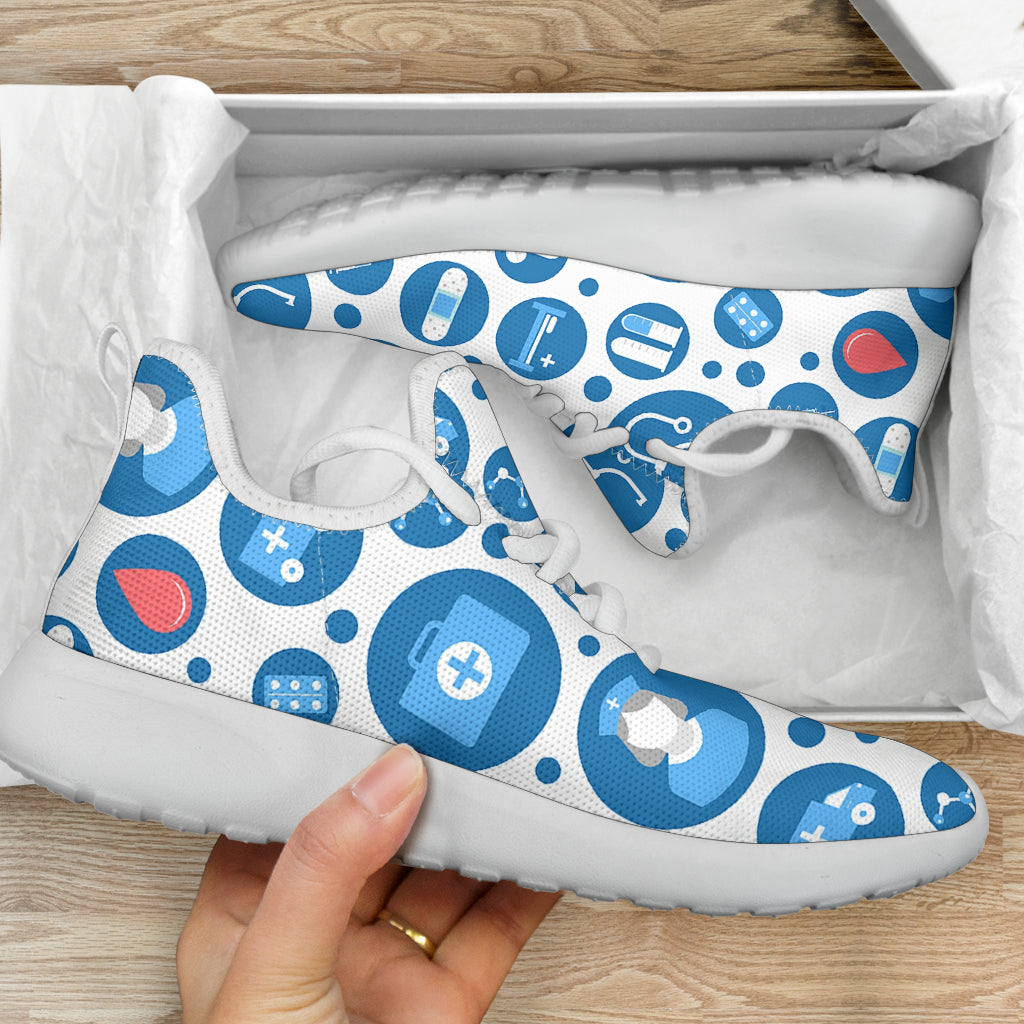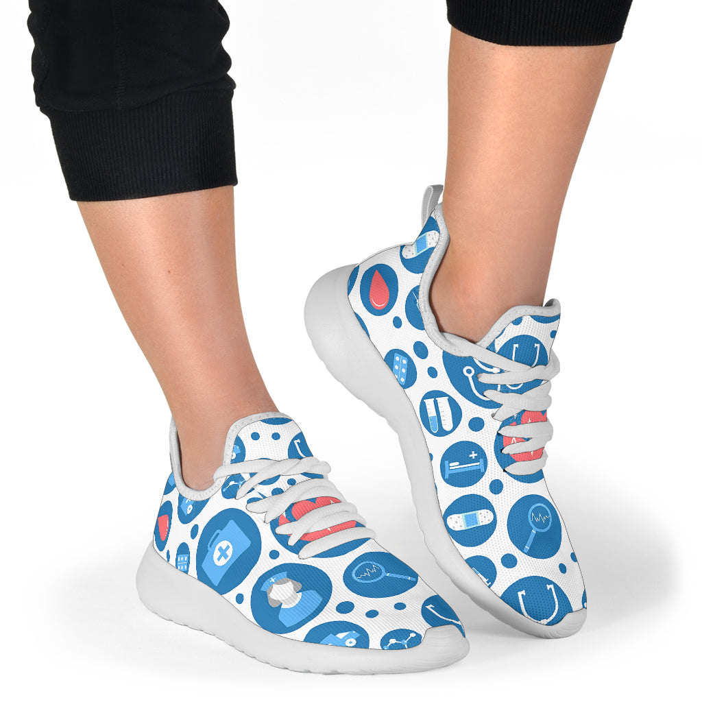 Baskets d'infirmière en maille blanche 3 avec icônes médicales bleu-blanc