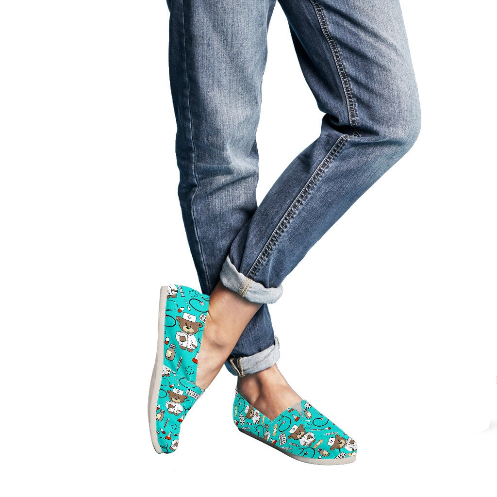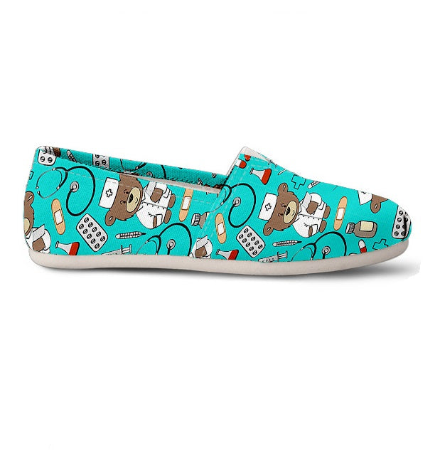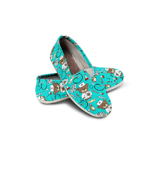 Queste ballerine da infermiera color azzurro chiaro presentano un orsetto marrone vestito con un'uniforme bianca da infermiera e un cappello con una croce rossa. Queste sneakers da infermiera sono inoltre decorate con altri simboli medici come pillole, becher, stetoscopi, siringhe, provette e portaprovette. Sono disponibili in una varietà di colori. Così carine e resistenti.