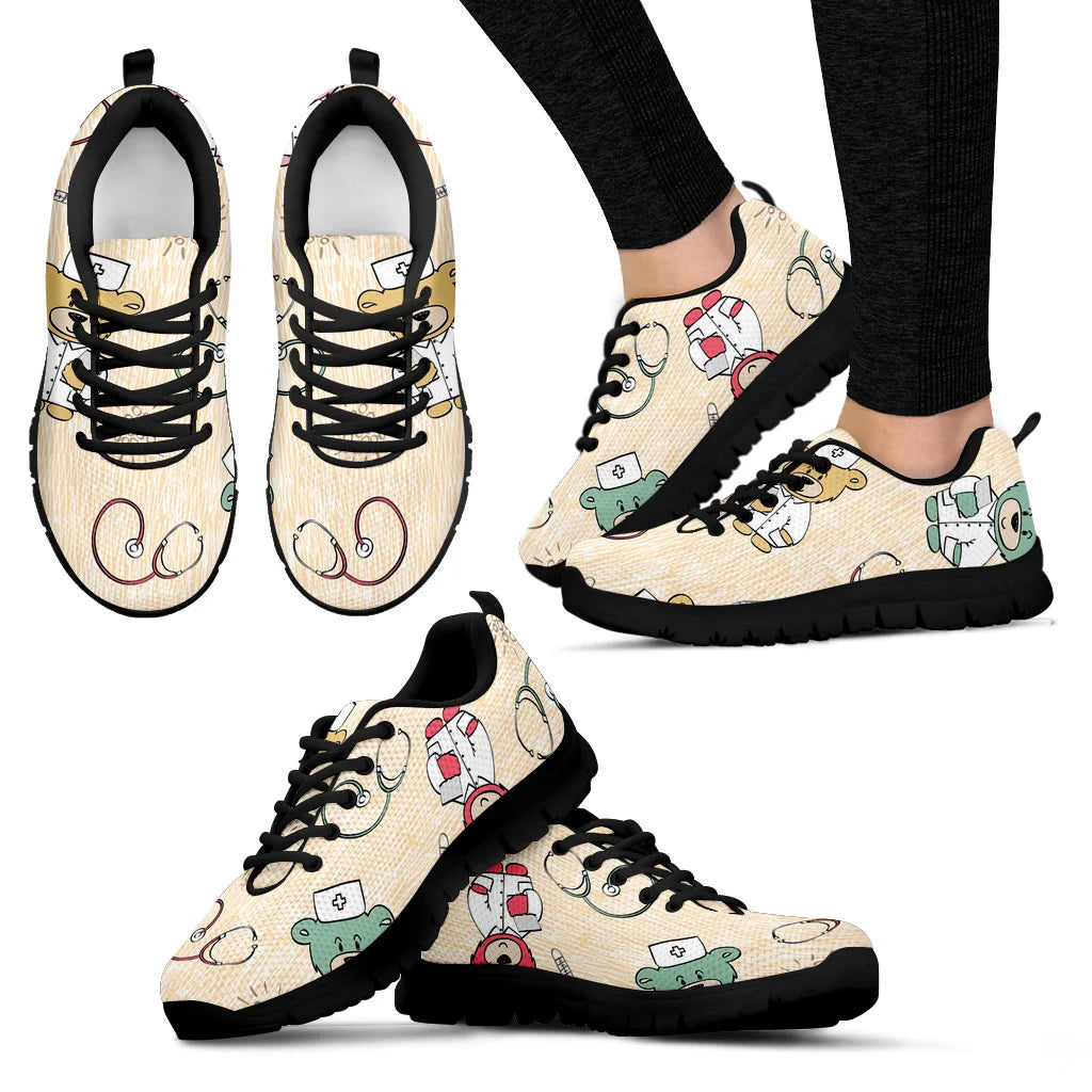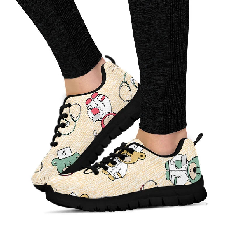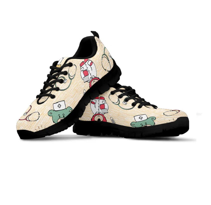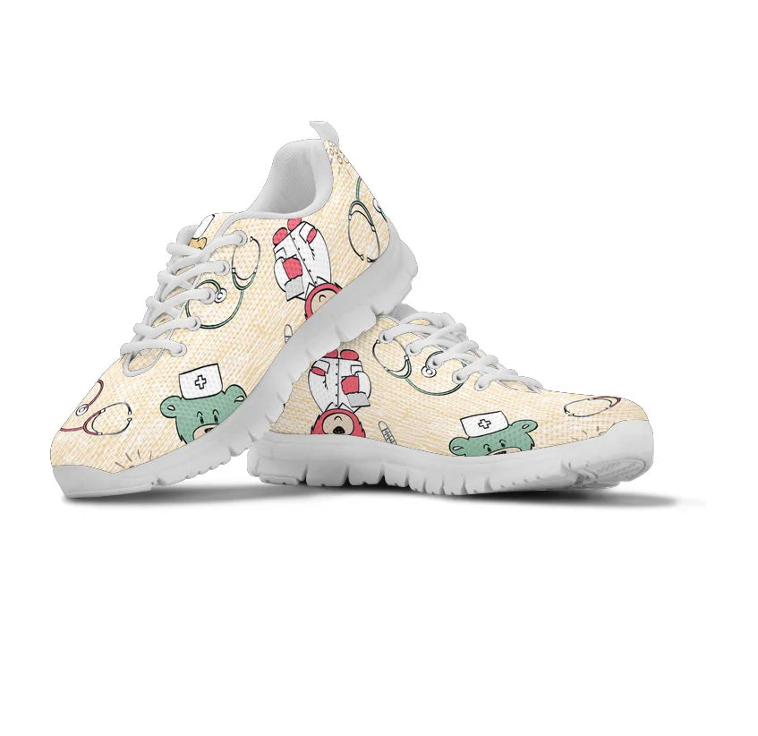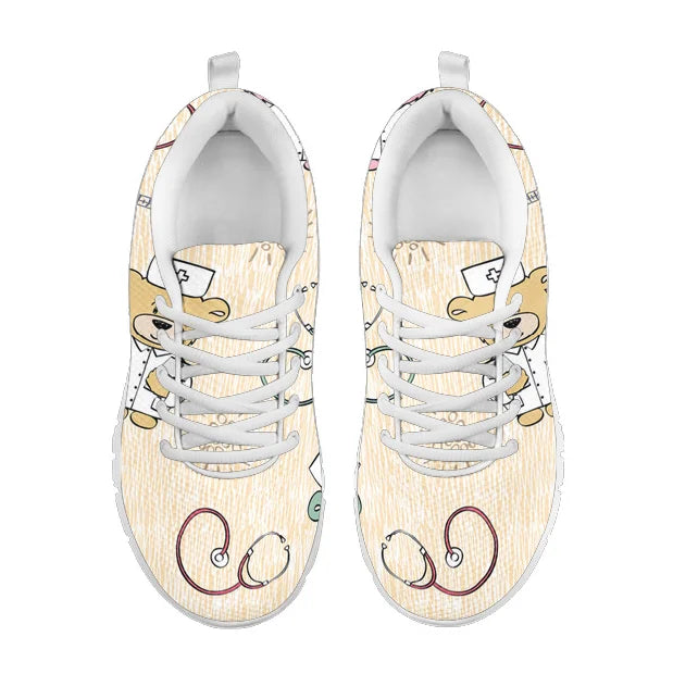Estas zapatillas de enfermera color crema vienen con ositos dorados, verdes y rojos vestidos con uniforme blanco de enfermera y gorra con una cruz roja. Tan adorables y resistentes.