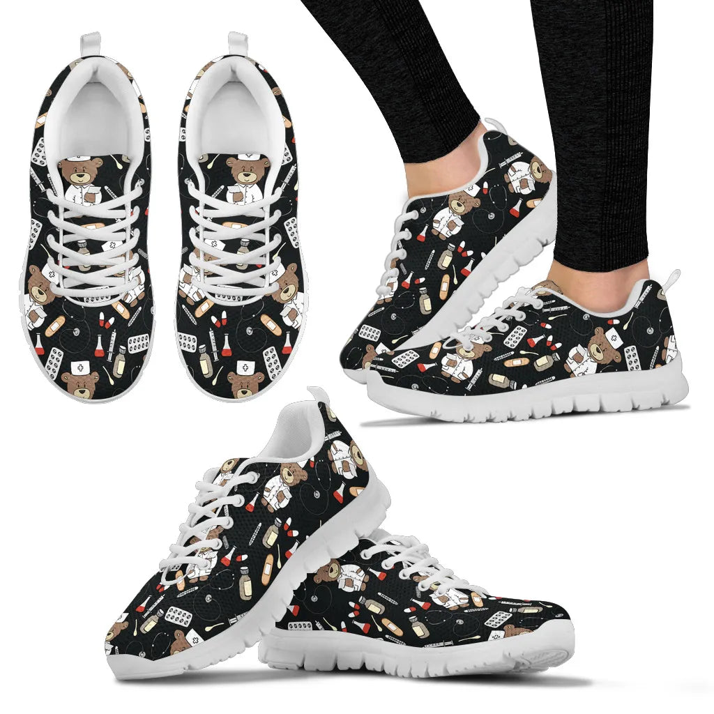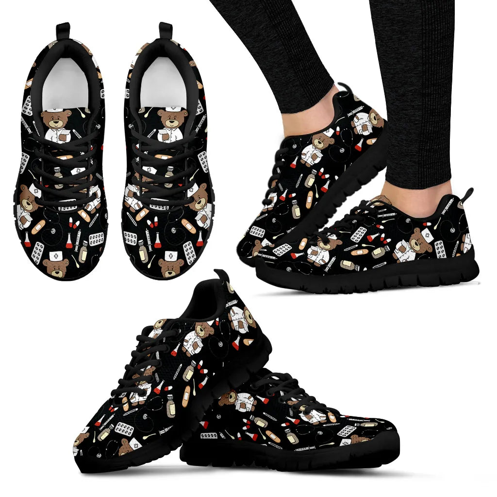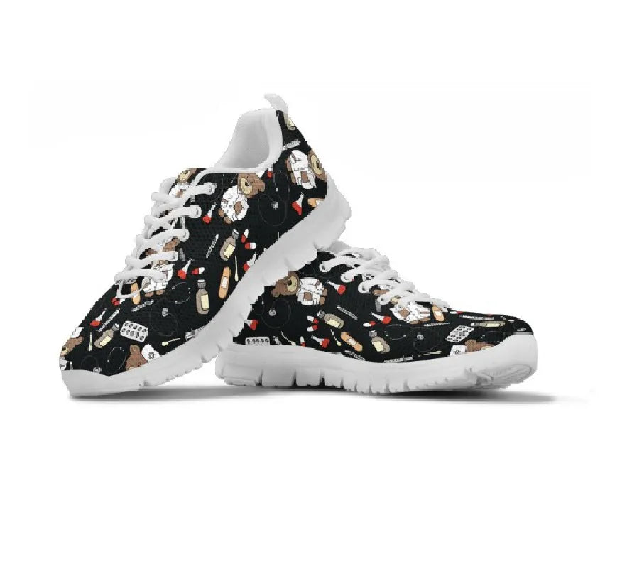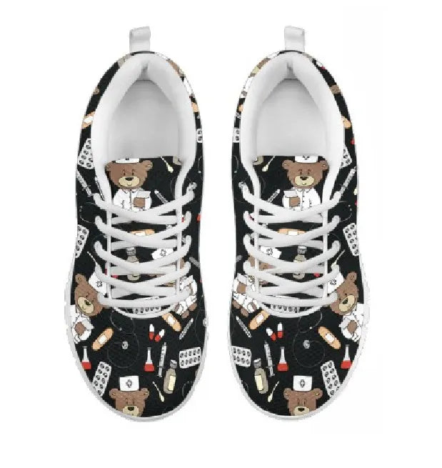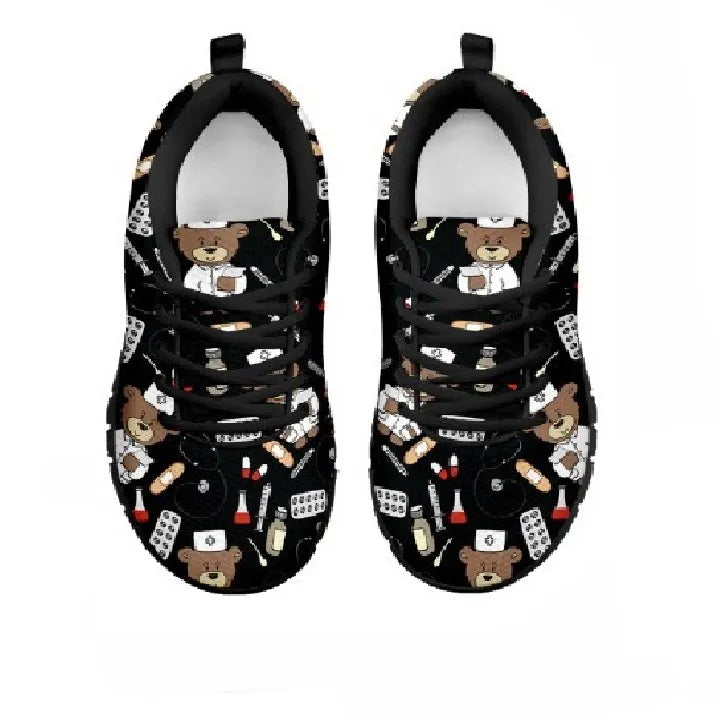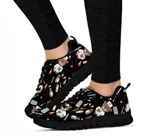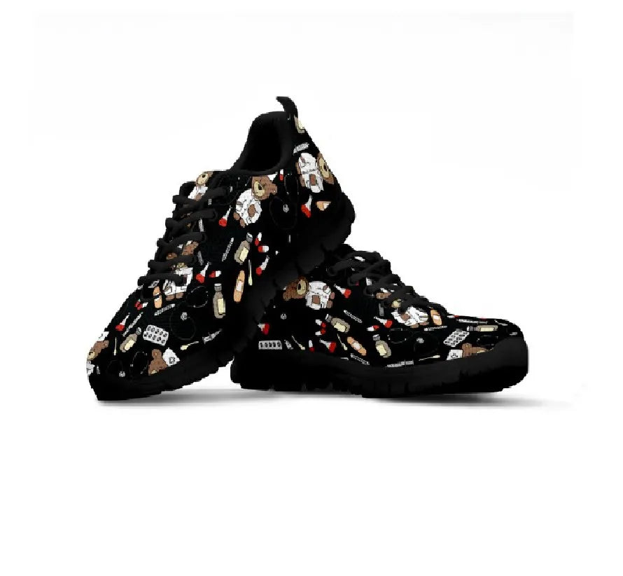 Estas sapatilhas de enfermeira de cor preta vêm com um urso castanho vestido com um uniforme branco de enfermeira e um boné com uma cruz vermelha. Tão fofas e duradouras.