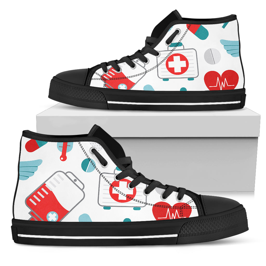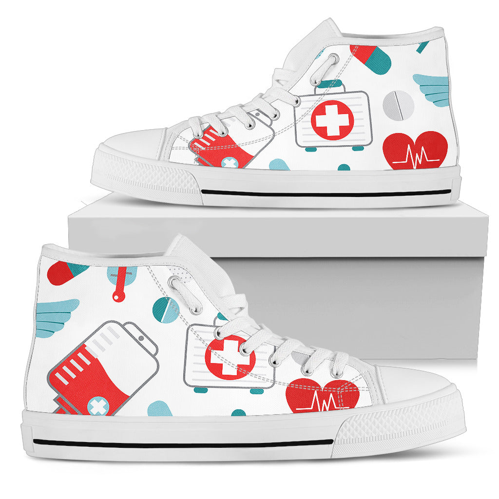 Sapatilhas altas brancas em rede para enfermeiros com símbolos médicos em verde-azulado/vermelho