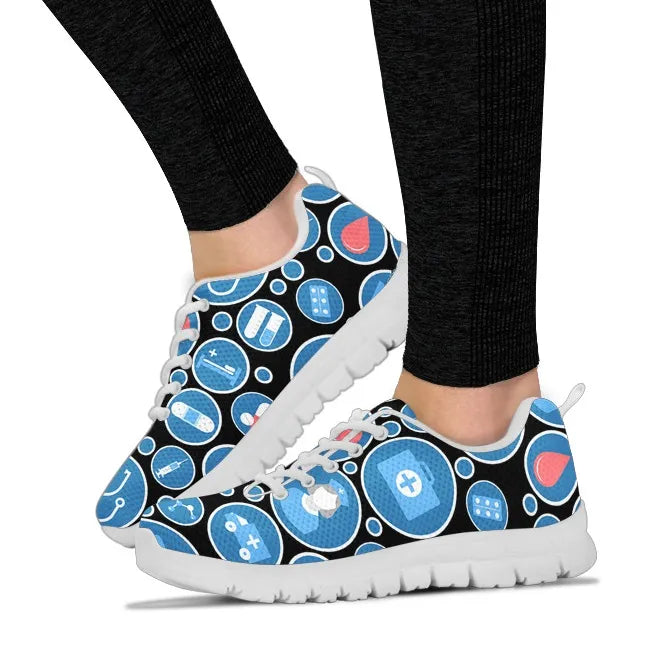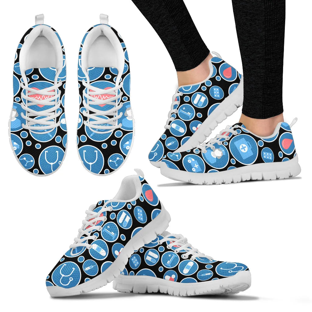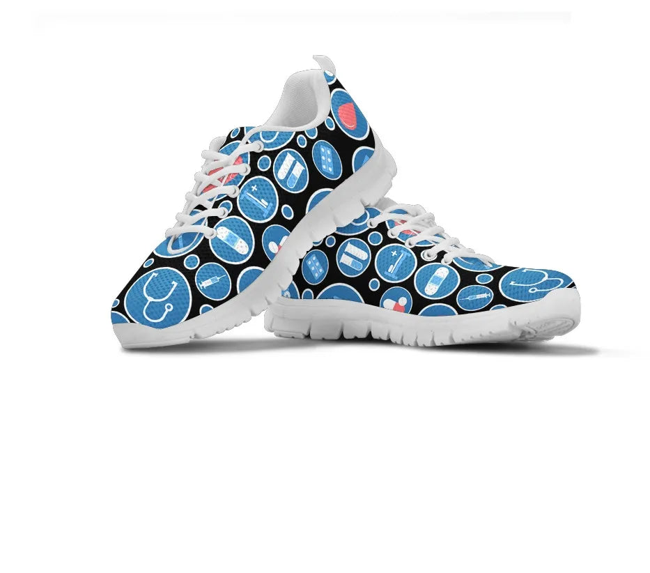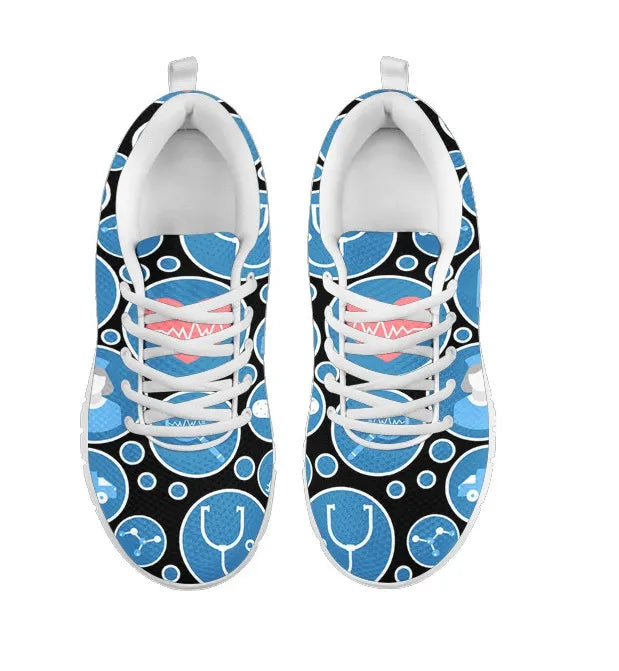 Estes ténis têm vários ícones médicos impressos em azul e branco, como seringa, enfermeiro, ambulância, kit médico, comprimidos, tubo de ensaio e suporte para tubos de ensaio com um grande coração vermelho no meio.