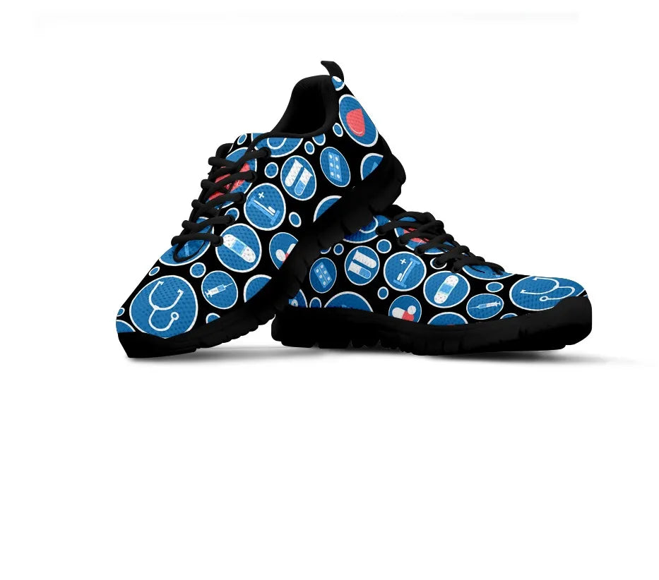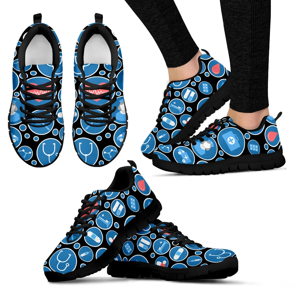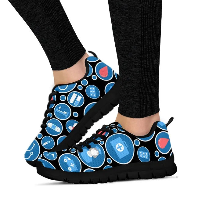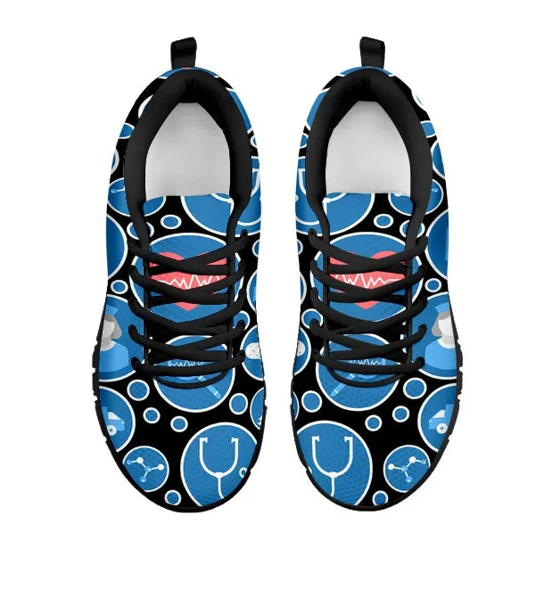 Ténis de Enfermagem Femininos Pretos em Malha 3 com Ícones Médicos Azul e Branco