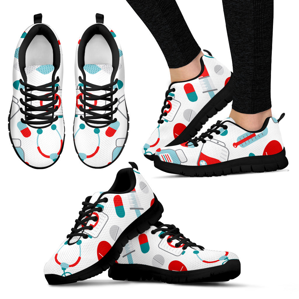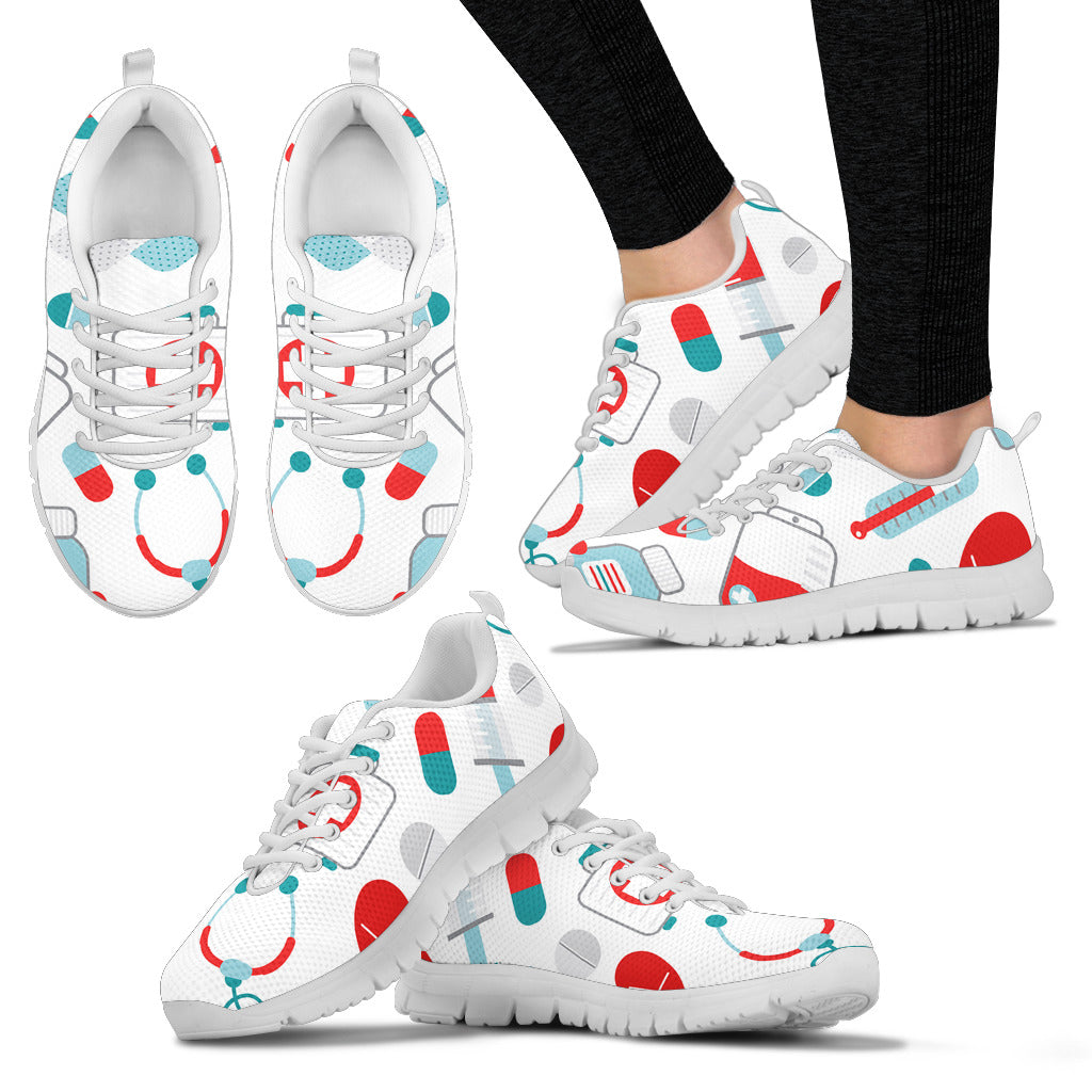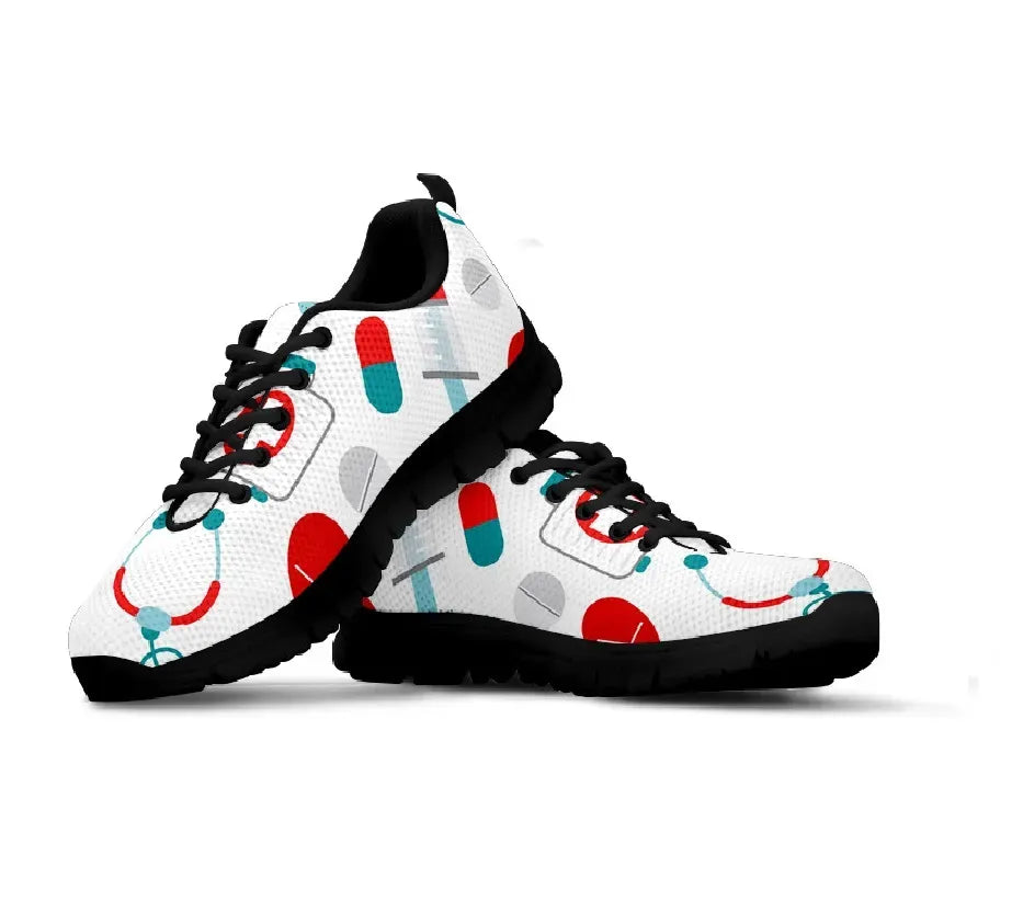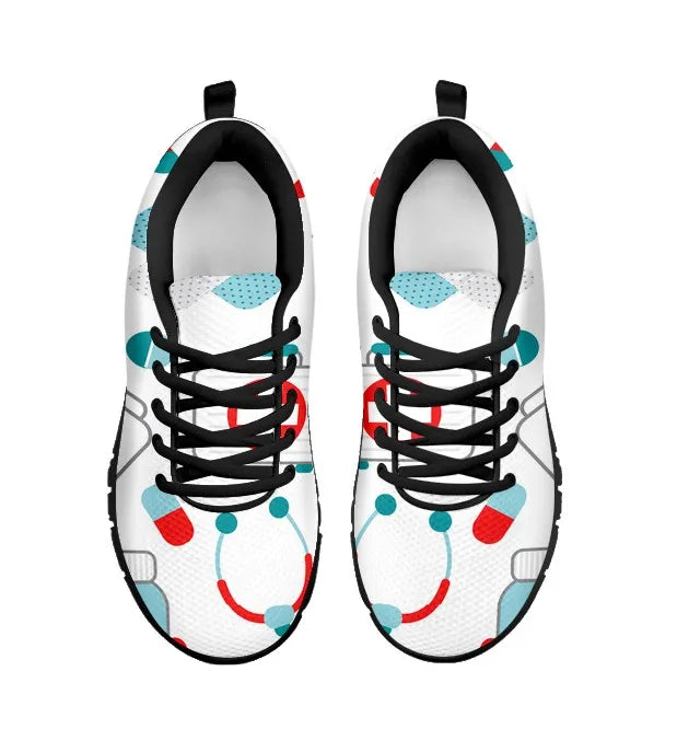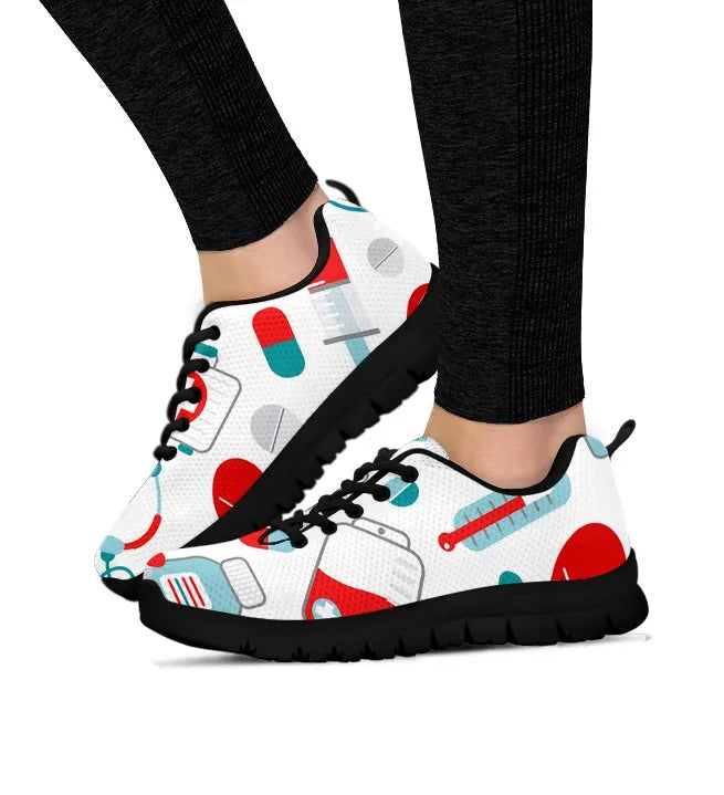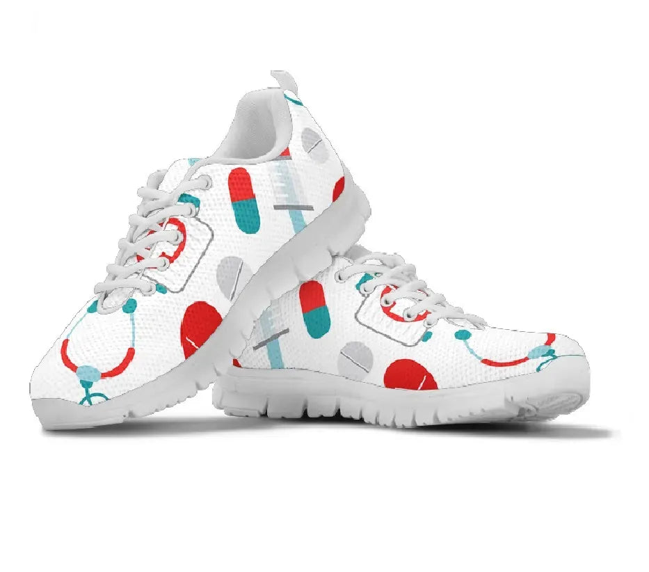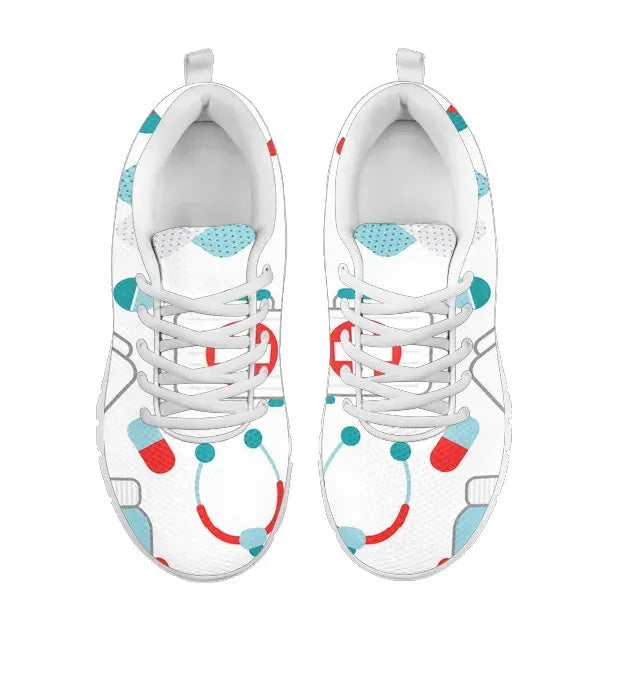 Sapatilha de Enfermagem em Malha Branca 10 com Símbolos Médicos em Verde-azulado/Vermelho