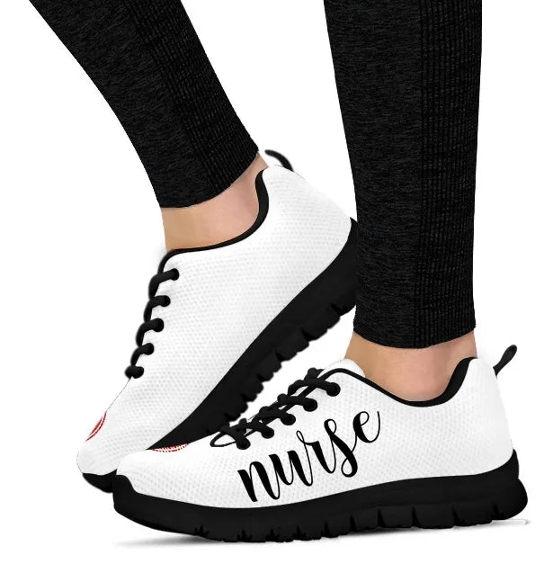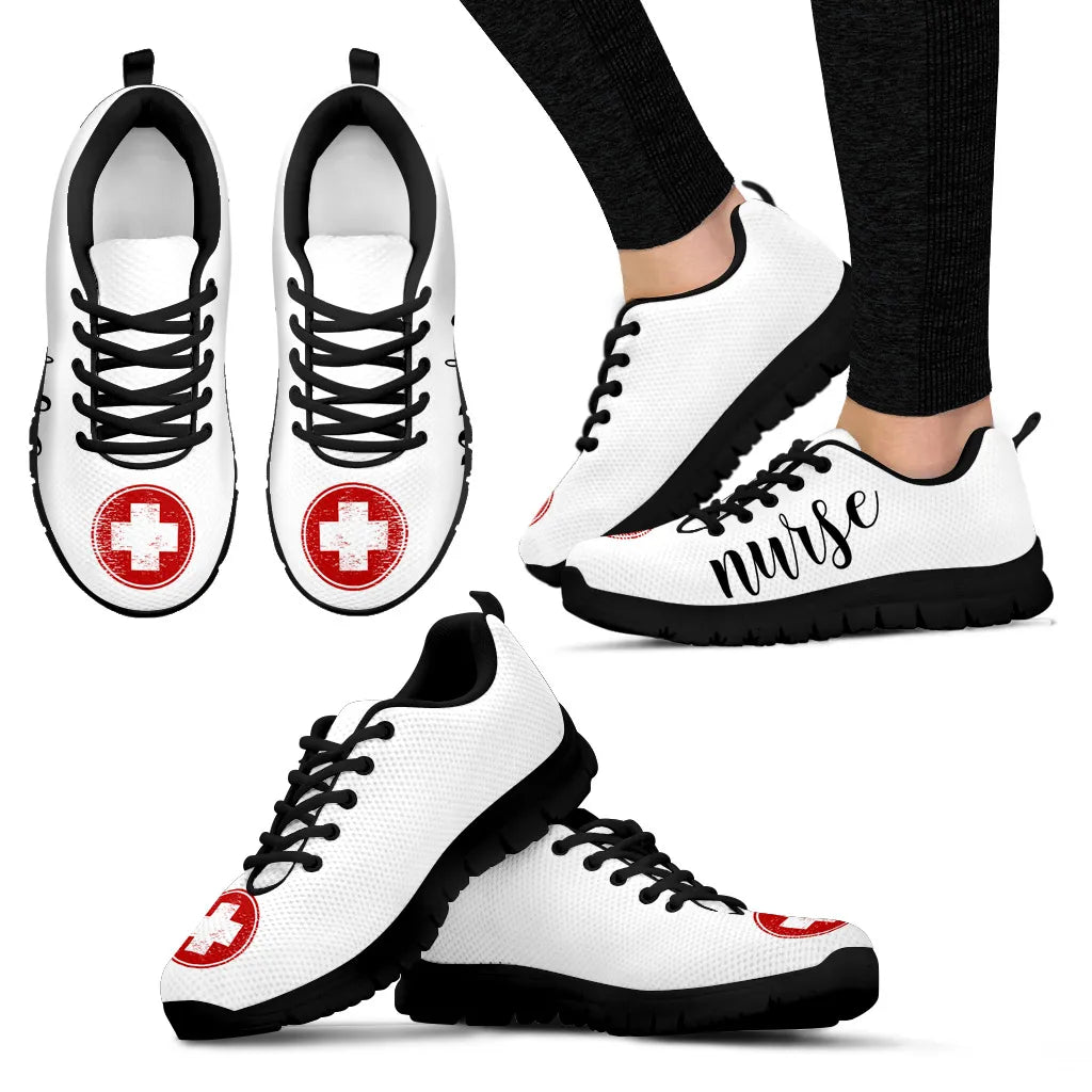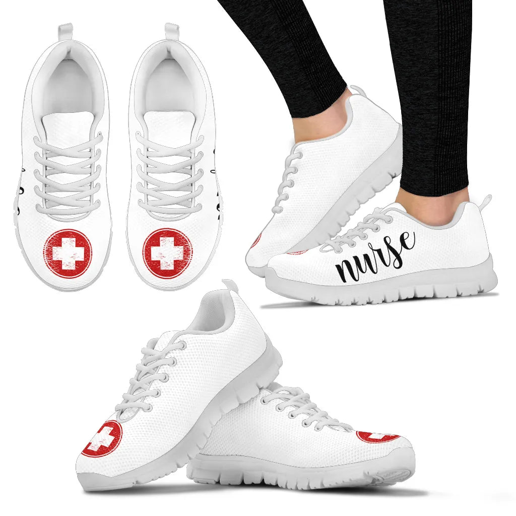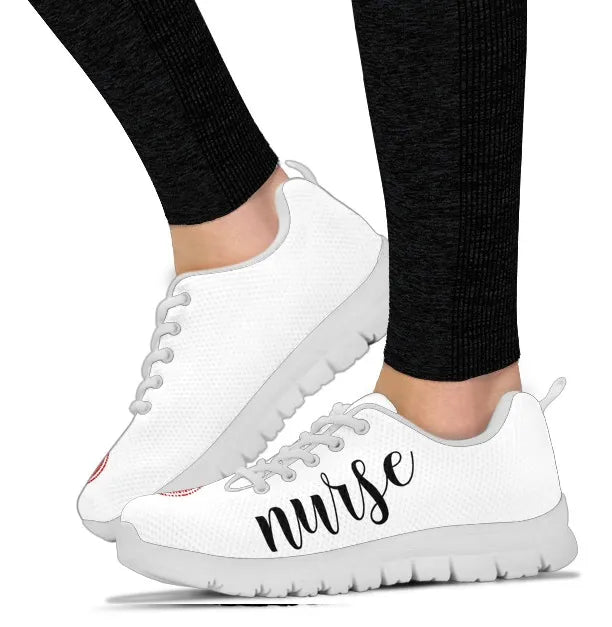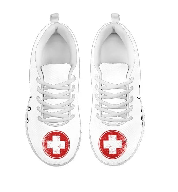 Estas sapatilhas de enfermeira em rede branca têm uma grande cruz vermelha na frente e a palavra "nurse" escrita no lado. São confortáveis e modernas, e uma ótima forma de iniciar conversas com desconhecidos.