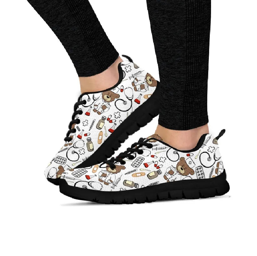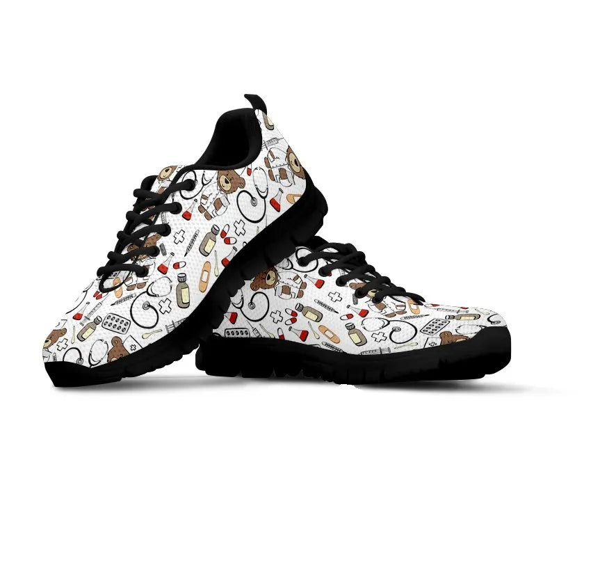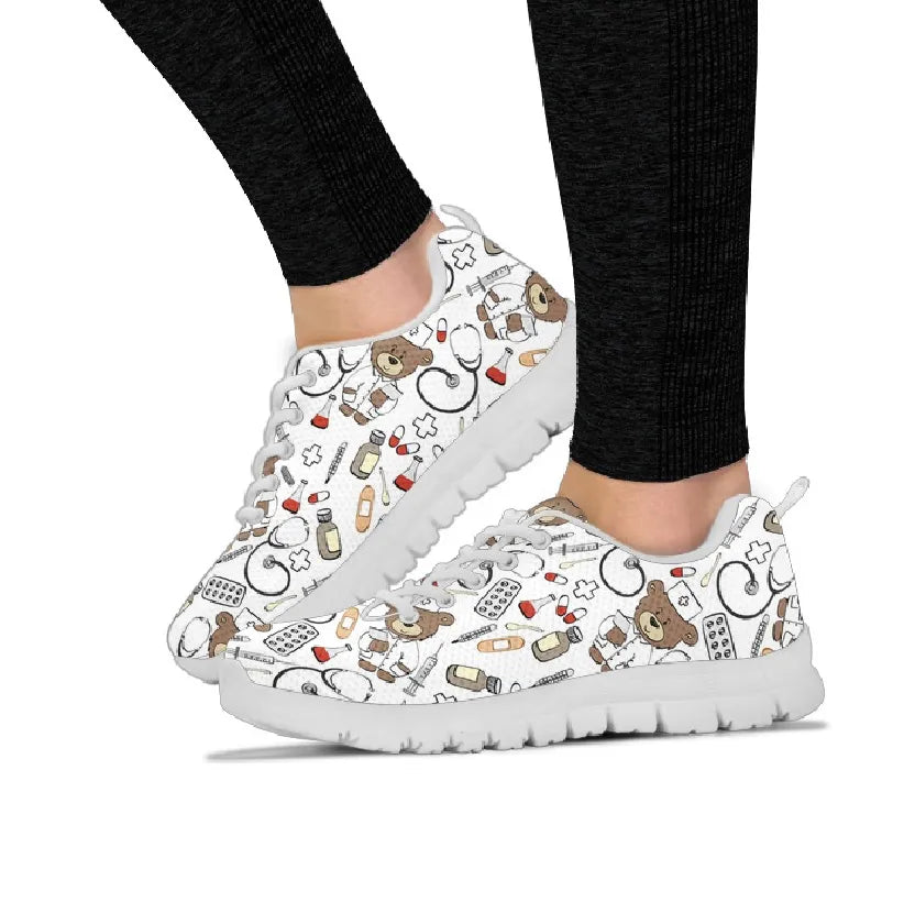 Estas giras Ténis de Enfermeira Urso Brancos têm um urso fofo vestido com um uniforme branco de auxiliar médico, usando um boné com uma cruz vermelha. Este ténis de enfermeira é também adornado com outros símbolos médicos, como comprimidos, béqueres, estetoscópios, seringas, tubos de ensaio, suportes para tubos de ensaio. Está disponível numa variedade de cores.